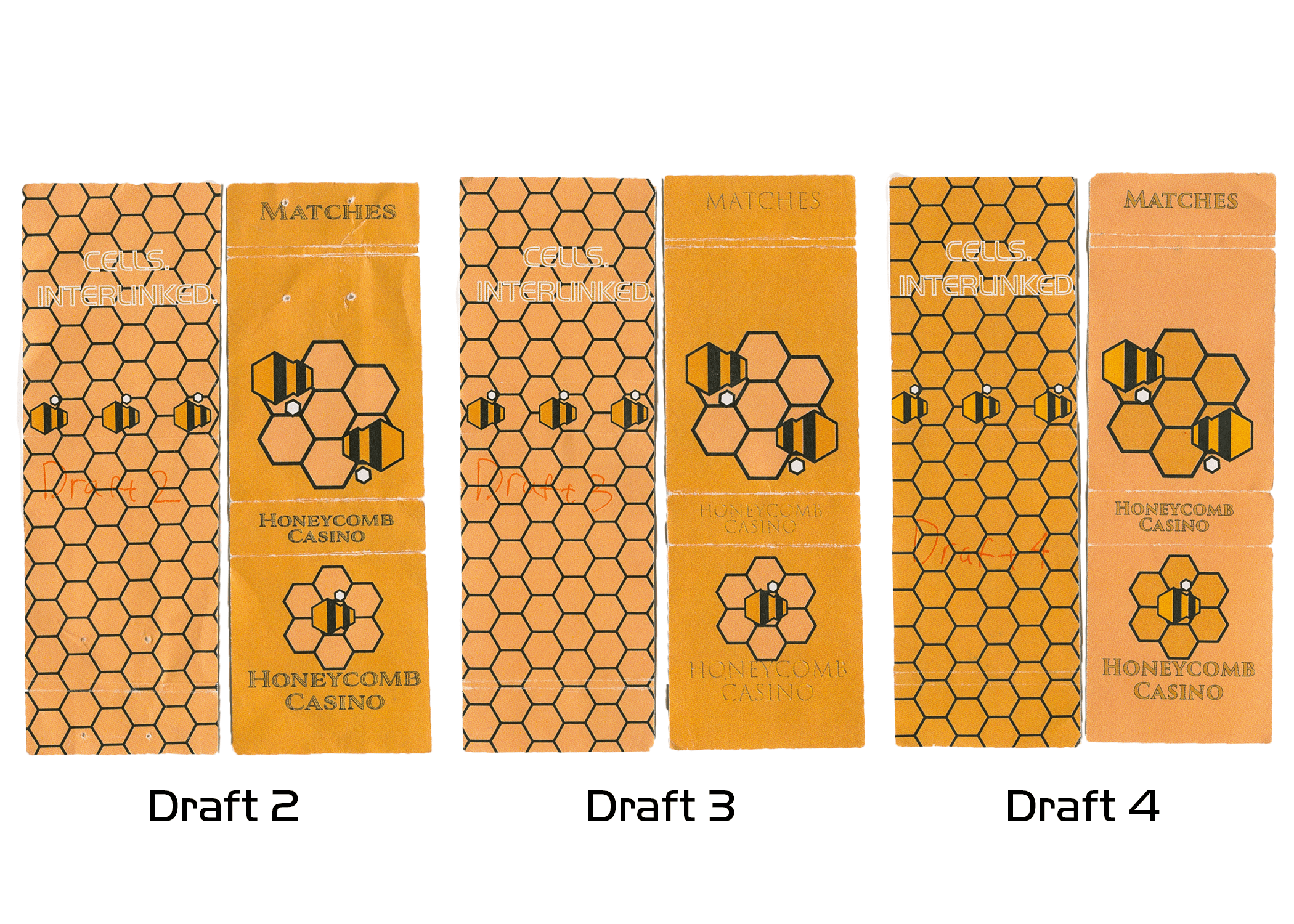 In the second watch-through, the main character heads to a radioactive Las Vegas. He eventually arrives at an unnamed casino. In this setting he is in a less technological advanced area, which deemed acceptable for a place a matchbook would be. Since the casino had no name, I gave it the identity of "Honeycomb Casino," as a reference to a scene with a honeybee farm.